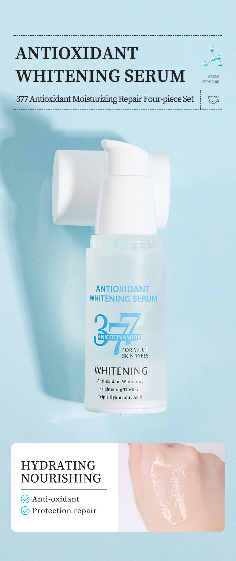 1、極致透白精華液:采用最新科技配方,富含多種美白成分,深入肌膚底層,抑制黑色素生成,提亮膚色,其質(zhì)地輕盈,容易被肌膚吸收,讓你的肌膚在短時(shí)間內(nèi)煥發(fā)出白皙光澤。
