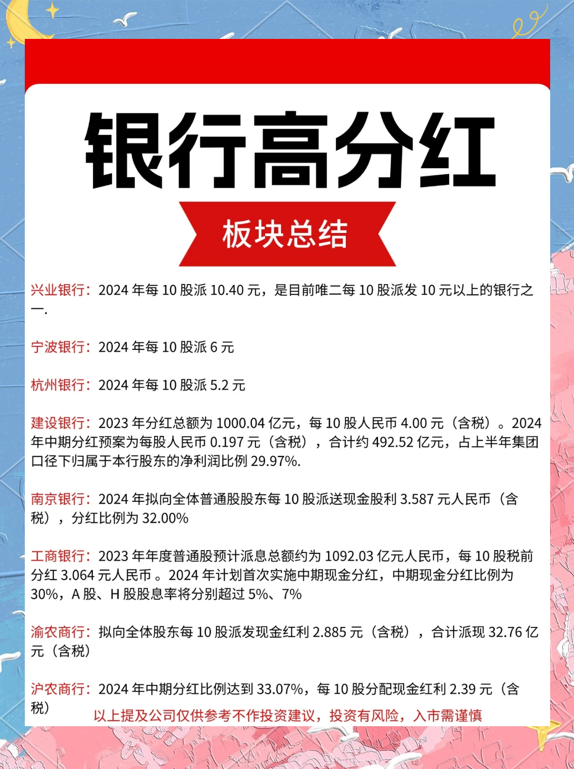 1、大型商業(yè)銀行:由于其業(yè)務(wù)規(guī)模大、市場(chǎng)份額穩(wěn)定,通常實(shí)施較為穩(wěn)定的分紅政策,分紅比例較高。